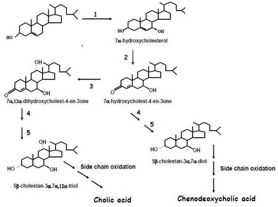 Degradation to primary bile acids represents the most relevant mechanism of irreversible elimination of cholesterol from the body, thus playing a key role in hepatic and systemic cholesterol homeostasis. Under physiological conditions, approximately 300–400 mg of cholesterol are disposed of in the liver daily, through this pathway [3].