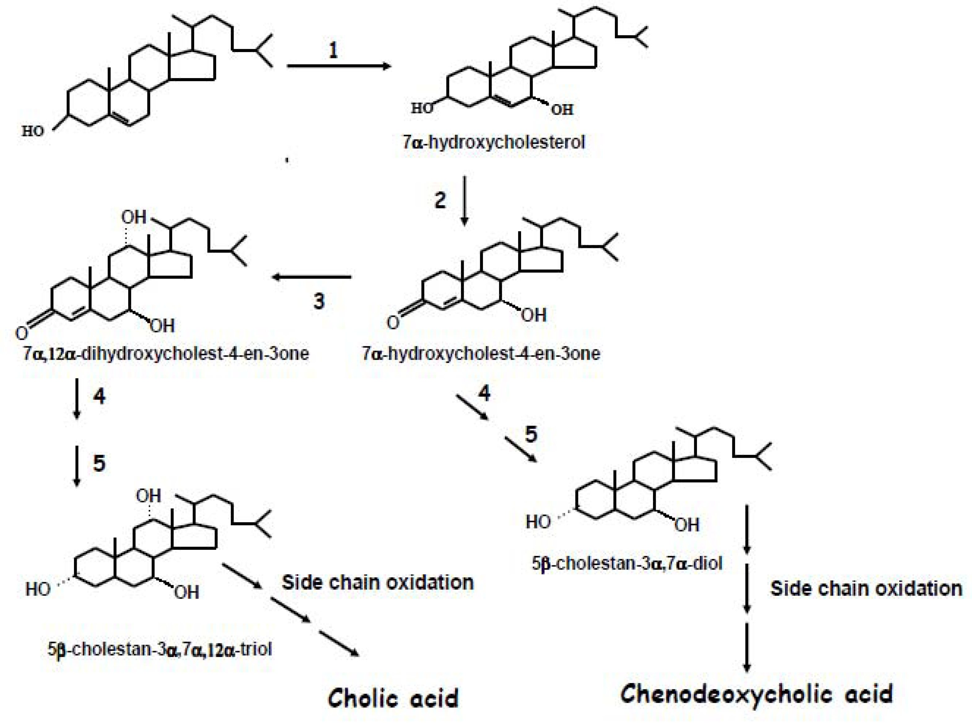 Illustration of the main metabolic steps of the classical pathway of bile acid synthesis. 1: Cholesterol-7α-hydroxylase (CYP7A); 2: 3β-hydroxy-Δ5-C27-steroid dehydrogenase (C27β-HSD); 3: Sterol 12α-hydroxylase (CYP8B1); 4: Δ4-3-oxosteroid-5β-reductase; 5: 3α-hydroxysteroid dehydrogenase.