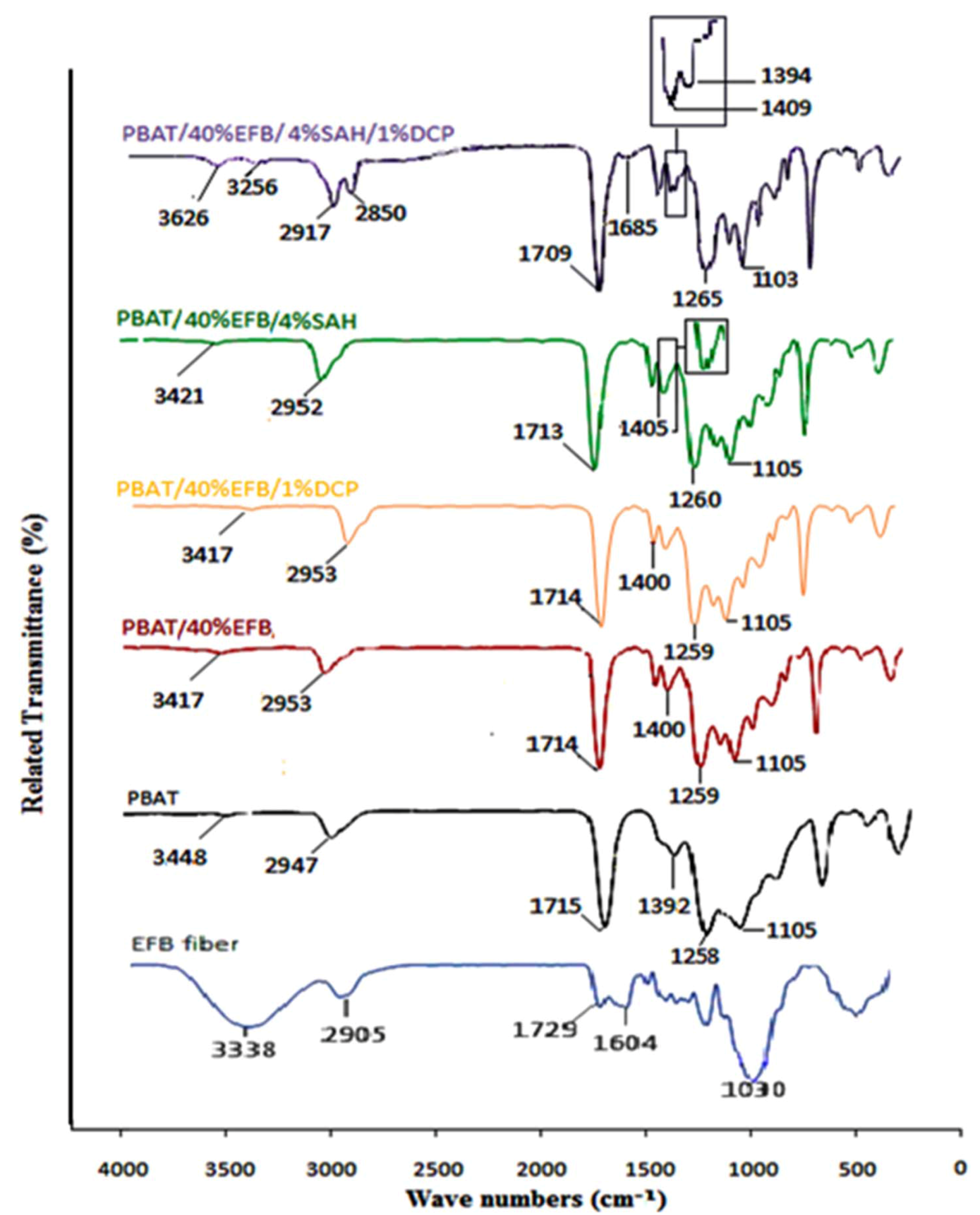 Based on composites spectra presented in Figure 1 and according to [12,13,14], the carbon-oxygen (–O–C–O–) stretching modes gave rise to intense and complex multiple peaks in the region between 1,000 cm−1 and 1,300 cm−1. The carbon-oxygen (–O–C–O–) stretching vibration appeared at 1,258 cm−1 in the virgin PBAT spectrum, which deviates with addition of SAH/DCP by 7 cm−1 and appears at 1,265 cm−1 in the PBAT/EFB/SAH/DCP.