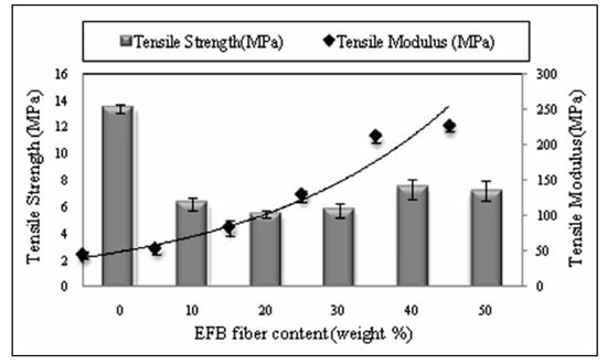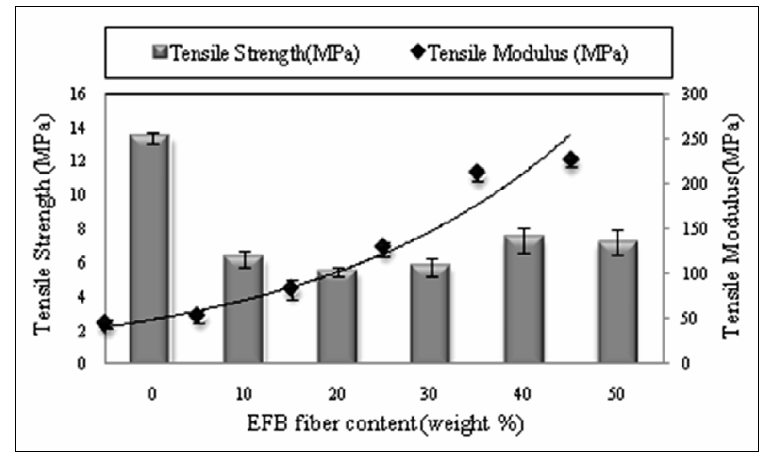 PBAT/EFB composites with different fiber content were fabricated in order to determine the best formulation of the biocomposite. Figure 2 depicts the variation of the tensile strength as well as tensile modulus as a function of oil palm EFB fiber loading. Addition of EFB fiber decreased the tensile strength of PBAT, although there is a moderate increase in tensile strength of composite at 40% of fiber loading and beyond this point, tensile strength decreased with the increase of fiber content. The highest tensile strength of 7.5 MPa was observed at 40% of fiber loading.