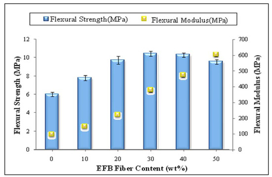 Figure 3 depicts the effect of fiber loading on flexural strength and flexural modulus of oil palm EFB fiber reinforced PBAT biocomposites. It is clear that both flexural strength and modulus show a continuous increase with the increase of EFB fiber loading, although there is a slight decrement in flexural strength from 40% to 50% fiber loaded biocomposite.