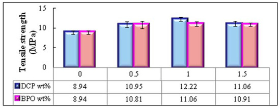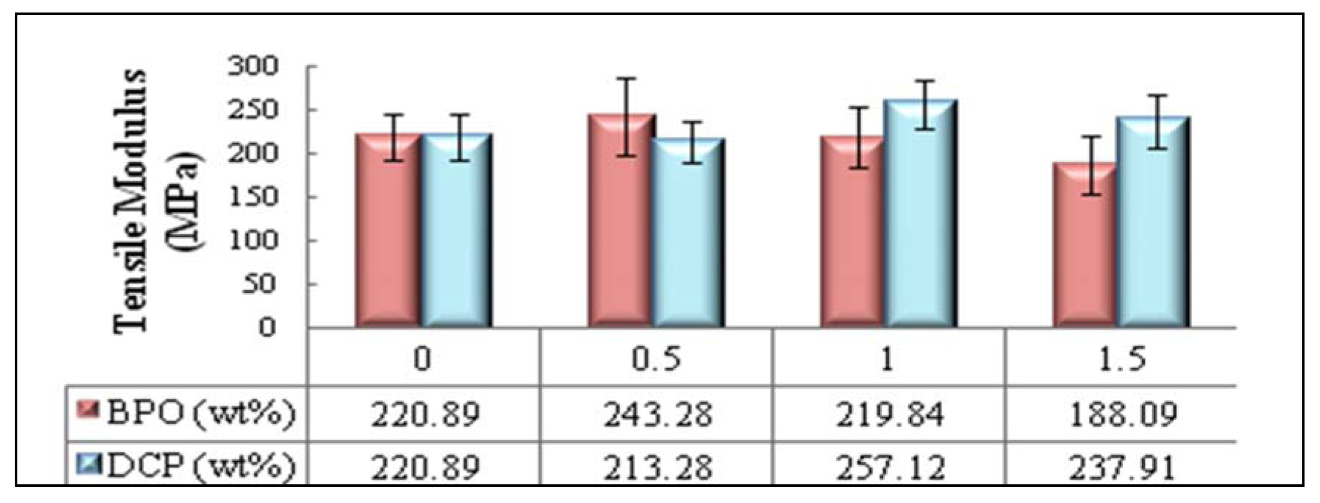 From Figure 5, it is obvious that 1 (wt %) DCP showed the best result in tensile strength of new biocomposite. There was a large increase in the tensile strength of PBAT/EFB fiber biocomposite (closely 36.6%) showing that SAH in collaboration of DCP has considerably improved the matrix interfacial adhesion with EFB during the biocomposite preparation. Besides, the 1 (wt %) of BPO initiator improved tensile strength of new biocomposite about 23% compared to the untreated sample, from 8.9 (MPa) to about 11.1 (MPa), which is also a notable improvement. Further addition of BPO did not improve the tensile strength significantly. These results showed a further enhanced compatibility of EFB sites with the PBAT in presence of DCP initiator, which could be due to the better solubility of DCP than BPO in the PBAT matrix [27]. However, with a further increase in the concentration of DCP initiator from 1 (wt %) to 1.5 (wt %) a decrease was observed in the tensile strength of biocomposite. This might be due to the crosslinking/chain branching, which is a competitive common side-reaction in high concentration of organic peroxide, specifically chain branching reaction may be occur when the grafting is promoted using a peroxide, in the free-radical melt grafting of anhydrides onto polyethylene [27].