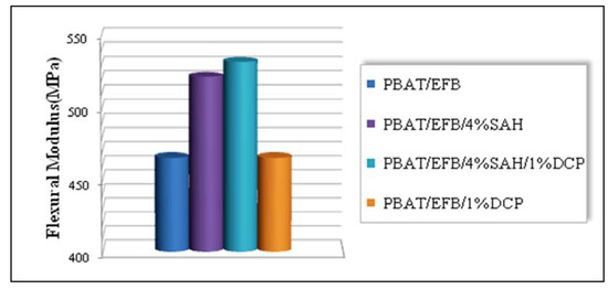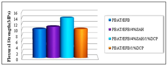 The effect of chemical treatments using SAH in presence and absence of DCP initiator on the flexural strength of new biocomposites compared to those of the untreated PBAT/EFB composites are shown in Figure 7.
