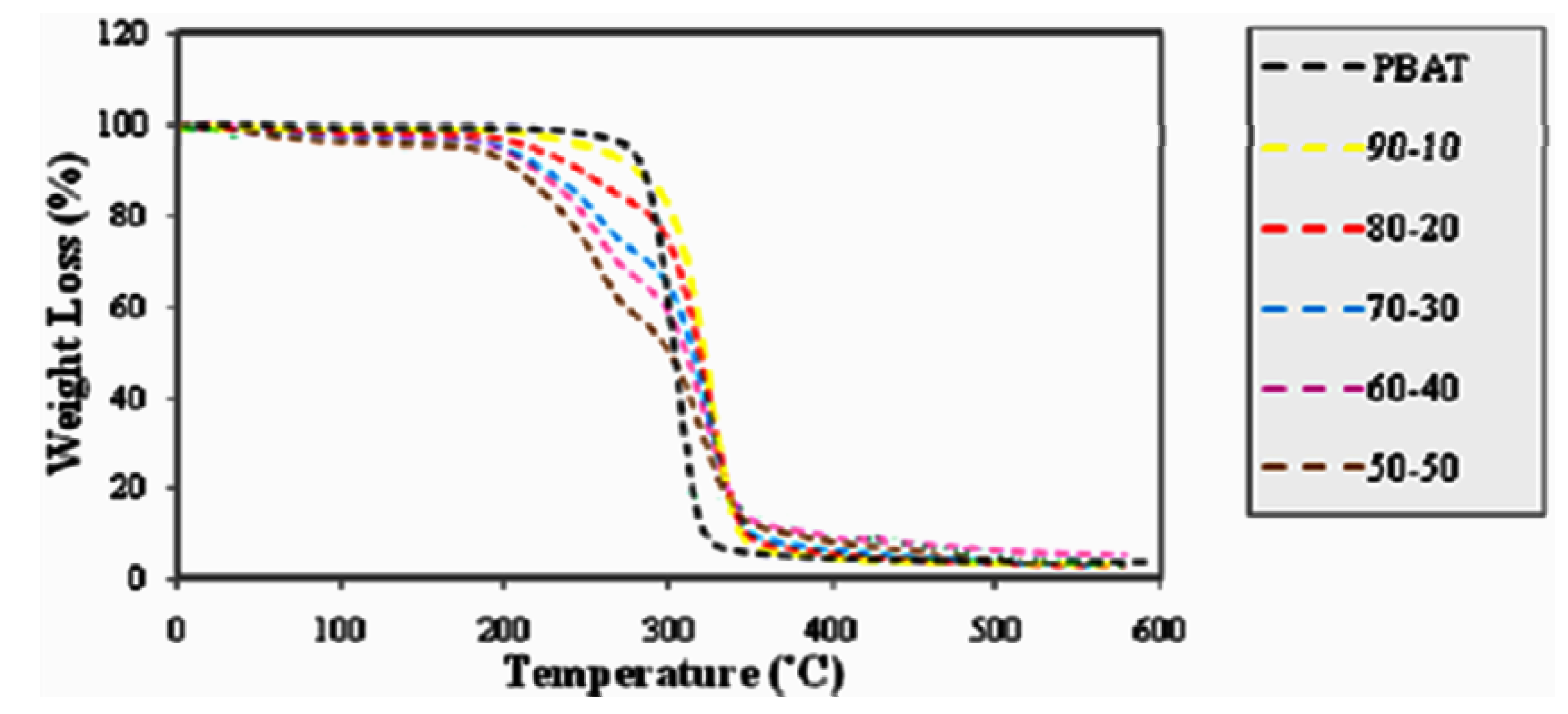 From the data presented in Table 2 we can conclude that the intermediate values of degradation temperature suggest again some kind of interaction between the PBAT matrix and fiber. Based on the weight percentage (wt %) of EFB fiber content, the thermal stability of PBAT/EFB fiber composites follows the sequence of 10% > 20% > 30% > 40% > 50% [2].