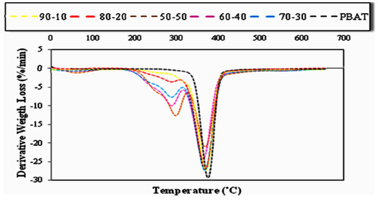 Alternatively, the thermal degradation of the PBAT/EFB composites with various fiber contents takes place in a two-step degradation process. Besides, mainly due to the decomposition of EFB fiber, the PBAT/EFB biocomposites exhibited initial mass loss from approximately 207 °C to 340 °C. Then, the second thermal degradation step, which is mainly related to PBAT degradation, overlapped with cellulose and lignin content in EFB fiber is observed. This two-step degradation process demonstrates that the thermal degradation temperature of the PBAT is higher than of the EFB fiber.