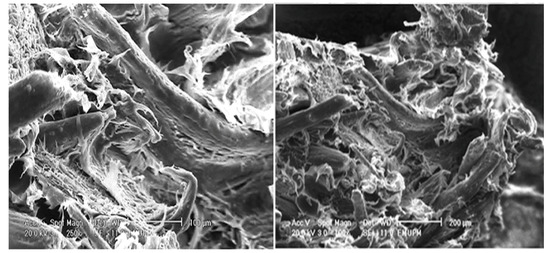 Figure 11 illustrates a scanning electron micrograph of the tensile fracture surface of PBAT/EFB composites at 40 (wt %) of fiber content. At first sight, the dispersion of fibers in the matrix, regardless of the employed surface treatment is clear, proving the efficient mixing of fibers in the matrix via melt blending of fibers and PBAT in Rheomixer. As seen in Figure 9, the EFB fiber composite fracture occurred, predominantly, by transversal fracture in the flat surface of the PBAT matrix. It is observed that the EFB particles in fiber form oriented in random arrangement, and as the adhesion fiber/matrix was poor, the composite shows some gaps and signs of pullout tendency. In addition to fiber pullout, some fiber breakage as the mean of fracture can also be seen in the PBAT/EFB untreated sample.
