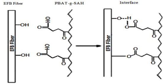 Both Pandey and Wu [17,18] deduced that the spectrum band near 3,330 cm−1 arises from hydroxyl groups (–OH) in the polymeric structure and since it is present at comparatively lower frequency than the free hydroxyl group (3,400–3,600 cm−1), this is due to intermolecular hydrogen bonding by the interaction between the carboxylic acid group (–COOH) of anhydride and the hydroxyl groups (–OH) of fiber. According to the IR spectrum of SAH-modified PBAT/EFB biocomposite in the presence of DCP initiator, compared to the untreated PBAT/EFB biocomposite, we can conclude that there are different chemical primary (covalent bonds) and secondary (hydrogen bonds) interactions between fiber and matrix after chemical treatment. The possible reaction mechanism between SAH, matrix and fiber with chemical modification is presented in Scheme 1, which is supported by the FTIR spectra presented in Figure 1.