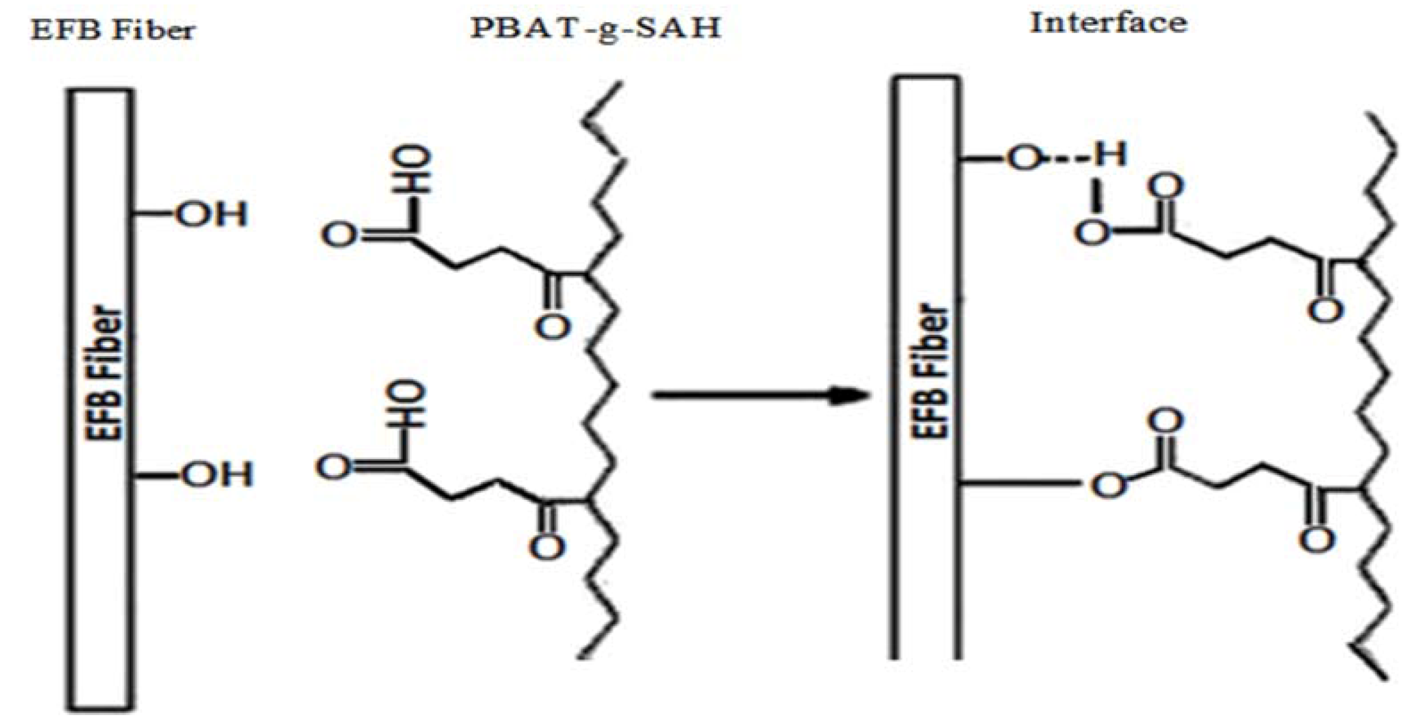 Consequently, chemical modification of biocomposite, using succinic anhydride as coupling agent and organic peroxides to initiate the graft mechanism in modification procedure, enhanced the fiber matrix interfacial interaction by improving their compatibility. It has also shown some positive effects on the tensile properties of the new biocomposite compared to the untreated PBAT/EFB biocomposite.