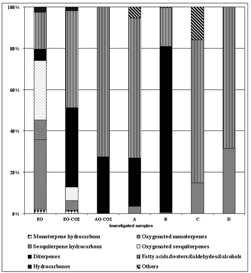 Comparative representation of particular groups of compounds (monoterpene hydrocarbons, oxygenated monoterpenes, sesquiterpene hydrocarbons, oxygenated sesquiterpene, diterpenes, fatty acids&esters&aldehydes&alcohols, hydrocarbons and others) in the investigated extracts obtained by hydrodistillation - HD (EO), supercritical carbon dioxide extraction - SC CO2 (EO-CO2 and AO-CO2) and successive solvent extraction - SE (A, B, C, and D).