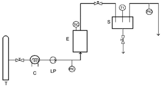 Schematic presentation of the autoclave engineers screening system—T: CO2 storage tank; C: cryostat; LP: high pressure liquid pump; E: extractor vessel; S: separator vessel.