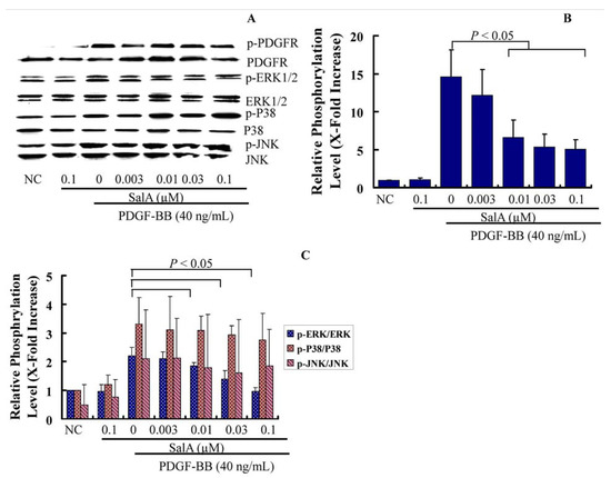 During endothelial injury after angioplasty or on the early stage of atherosclerosis, the PDGF-R/MAPK signaling pathway is upregulated. To further delineate the cellular and molecular mechanisms underlying SalA-induced growth inhibitionof VSMCs, we evaluated the effect of SalA on PEGFR and MAPK signaling cascades. The binding of PDGF-BB to the PDGF receptor (PDGF-R) leads to PDGF-R phosphorylation on multiple tyrosine residues at the receptor, which in turn potently activates MAPK by triggering RAS-RAF activation in VSMCs, resulting in cell cycle progression [18]. Therefore, the inhibition of VSMC proliferation and migration by regulation of the PDGF signaling pathway could be a key pharmacological strategy for the prevention of stent restenosis and atherosclerosis.
