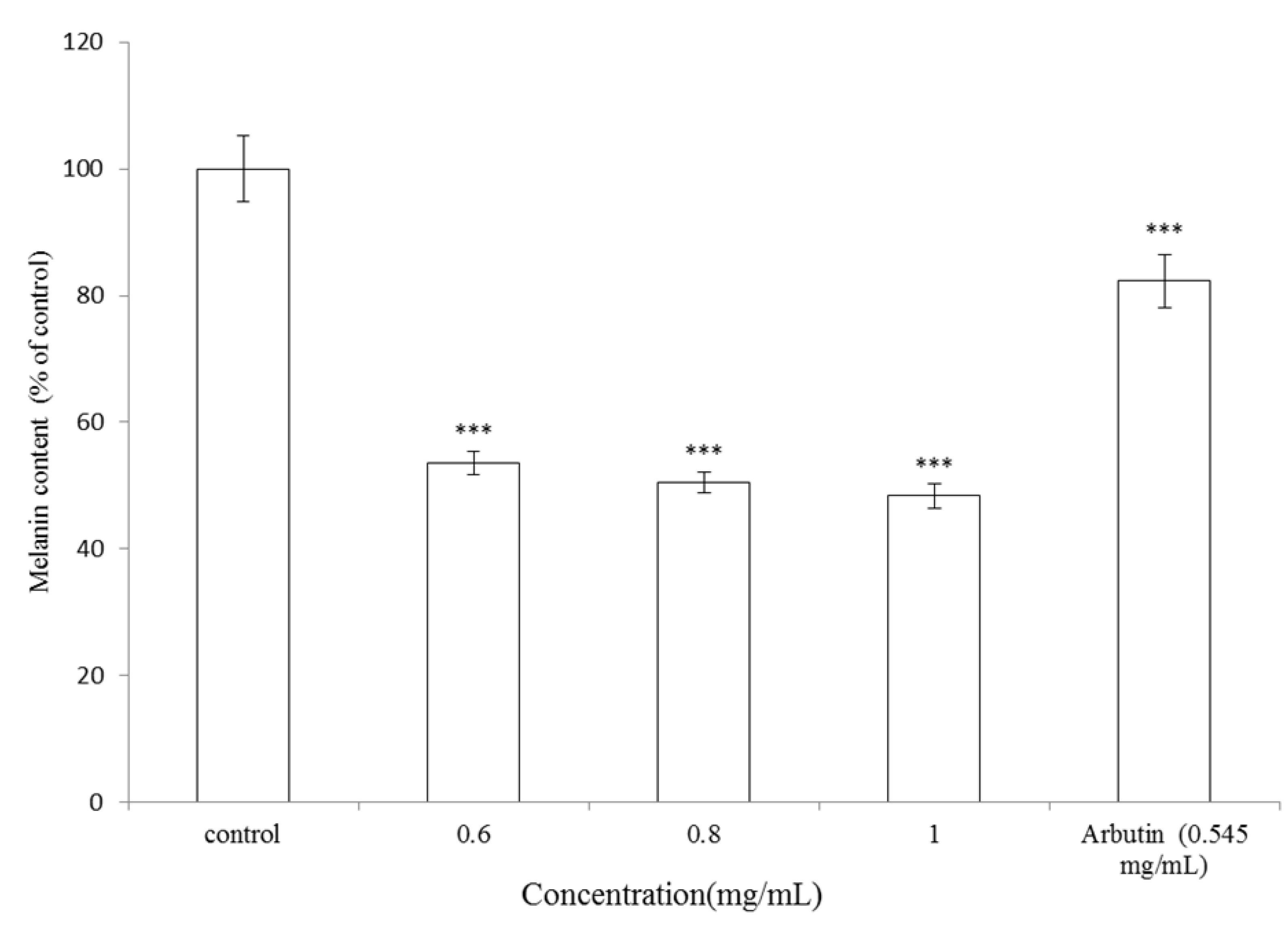 Figure 2. Effect of V. negundo Linn essential oil on melanin synthesis in B16F10 cells. Melanin content assessment was performed as briefly described below. The cells were cultured with α-MSH (100 nM) for 24 h, and then treated with various concentrations of V. negundo Linn essential oil (0.6–1.0 mg/mL) or arbutin (0.545 mg/mL) for 24 h. Results are represented as percentages of control, and data are presented as mean ± SD for three separate experiments. Values are significantly different by comparison with control. *** p < 0.001.