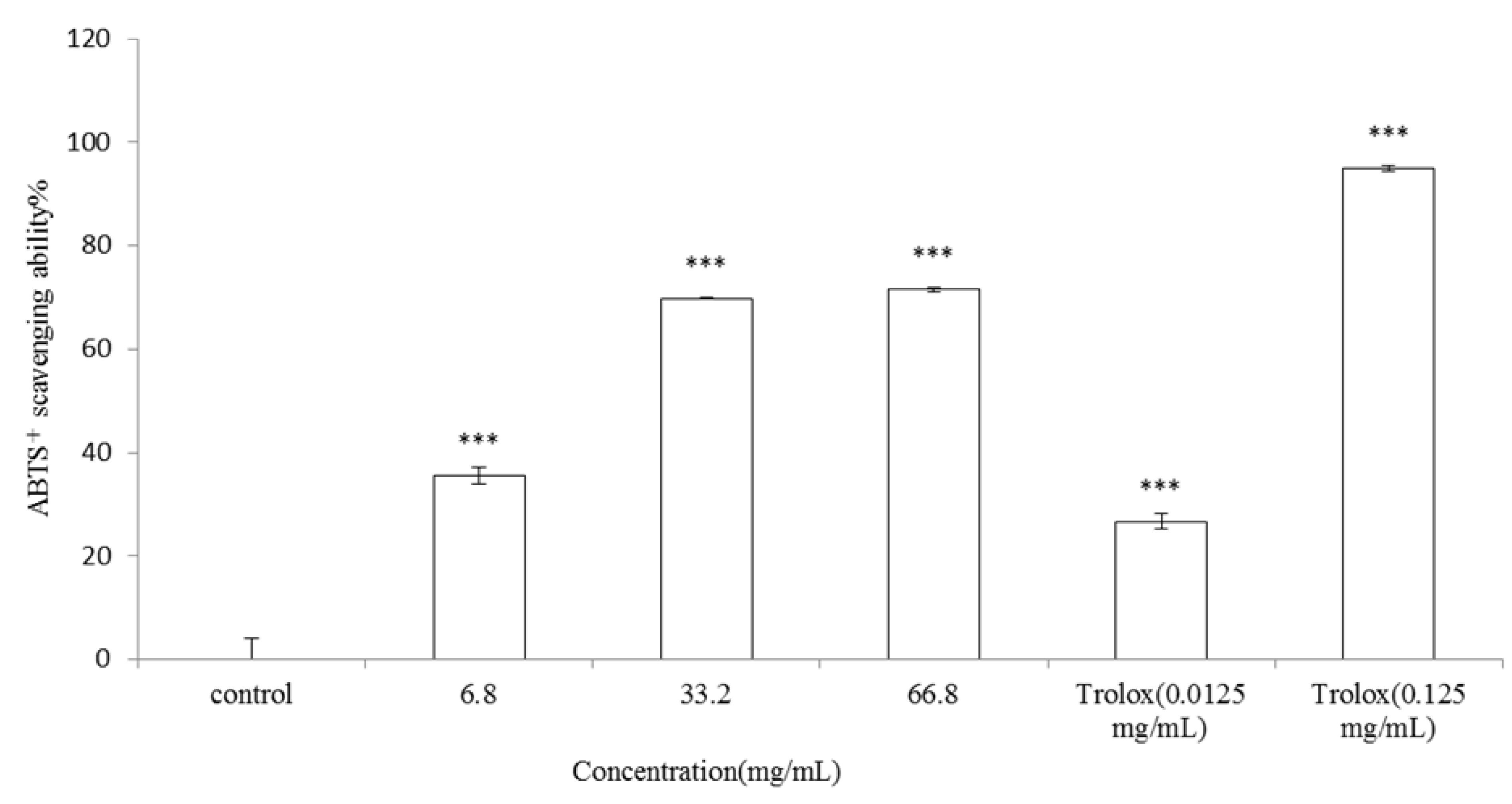 Figure 5. ABTS+ radical scavenging effects of V. negundo Linn essential oil.The essential oil (final concentration 6.8, 33.2, 66.8 mg/mL) or Trolox® (0.0125 or 0.125 mg/mL) were mixed with ABTS. Results are represented as percentages of control, and the data are mean ± SD for three separate experiments. Values are significantly different by comparison with control. *** p < 0.001.