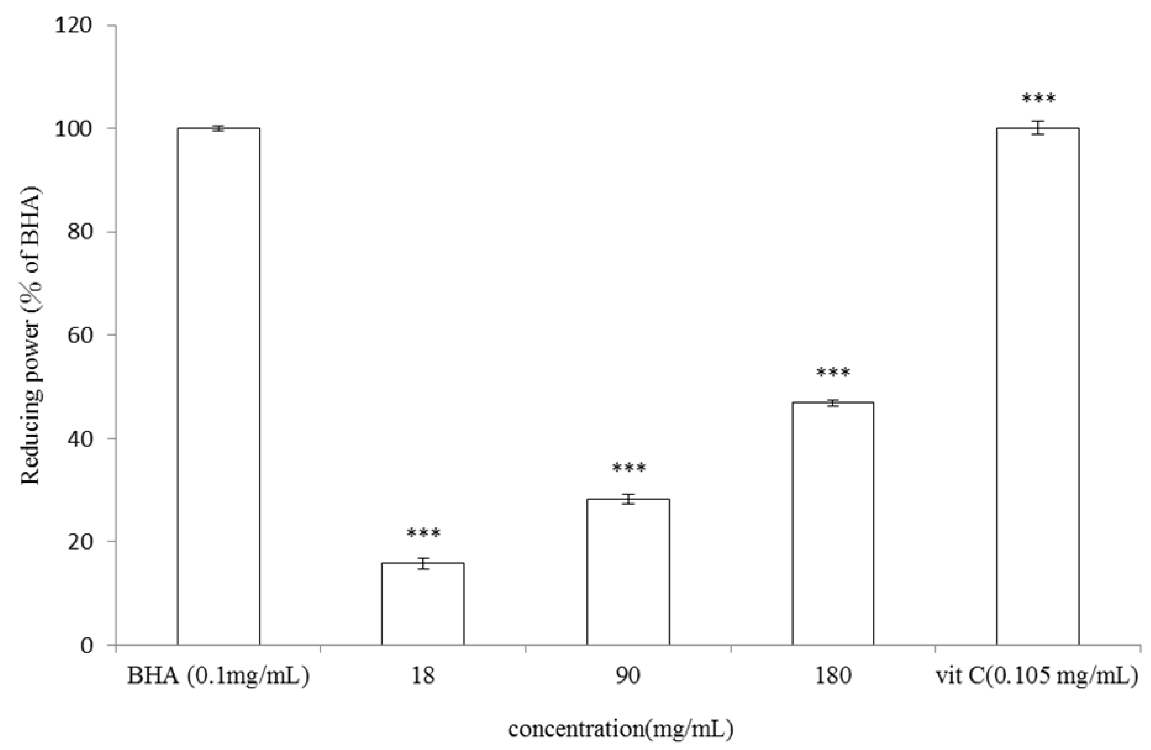 Figure 6. Reducing power of V. negundo Linn essential oil. Different concentrations of V. negundo Linn essential oil (18, 90, 180 mg/mL), vitamin C (0.105 mg/mL) or BHA (0.1 mg/mL) were used in the study. Results are represented as percentages of control, and the data are mean ± SD for three separate experiments. Values are significantly different by comparison with control. *** p < 0.001.