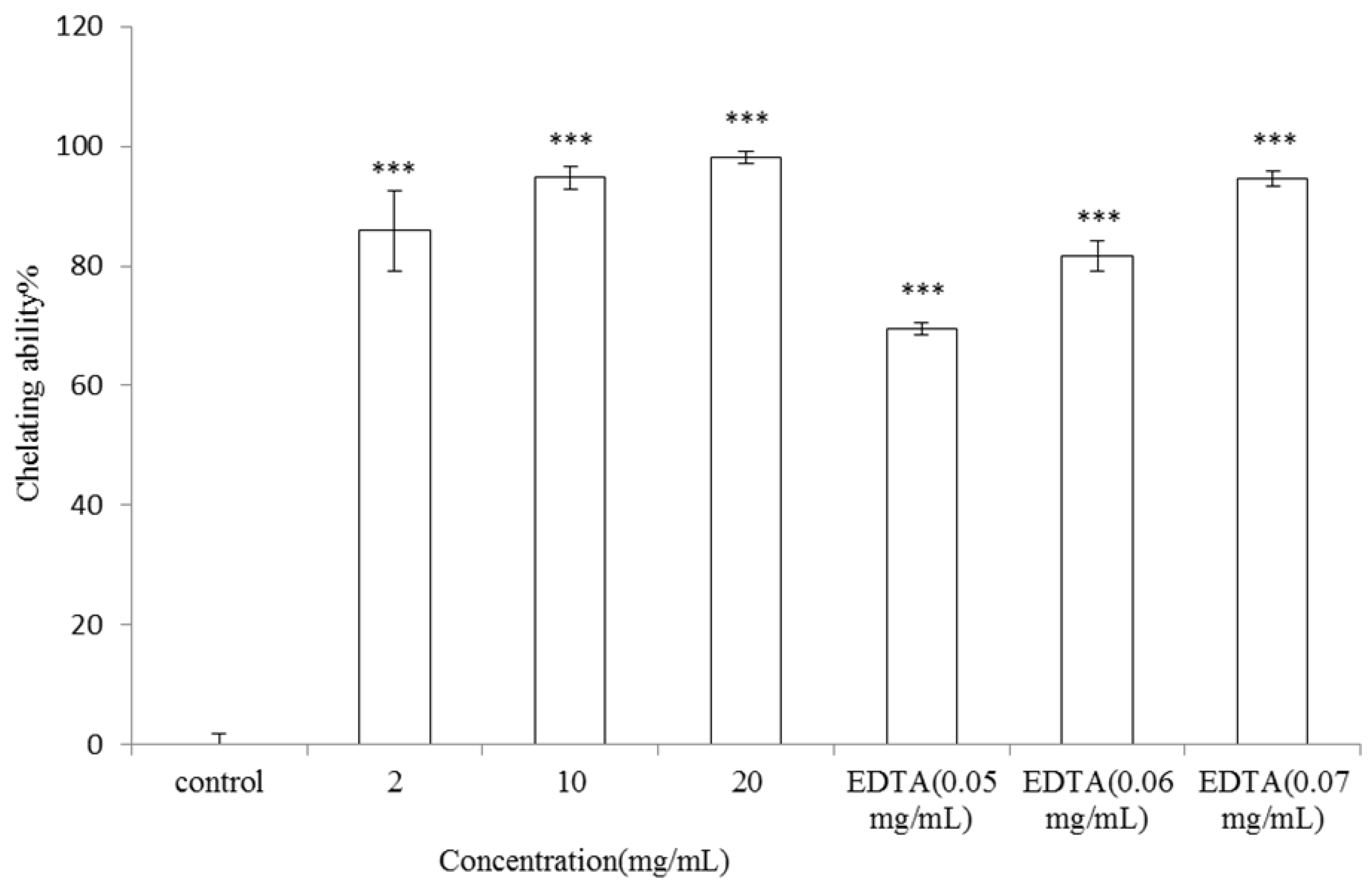 Figure 7. Metal-ion chelating activity of V. negundo Linn essential oil. Different concentrations of V. negundo Linn essential oil (2, 10, 20 mg/mL) or EDTA (0.05–0.07 mg/mL) were used in the study. Results are represented as percentages of control, and the data are mean ± SD for three separate experiments. Values are significantly different by comparison with control. *** p < 0.001.