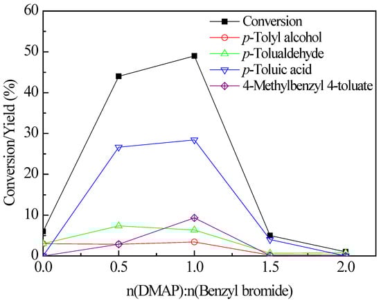 Influence of DMAP/benzyl bromide molar ratio; reaction conditions: 100 mmol of p-xylene, 2.5 mmol of benzyl bromide, 160 °C, 1.0 MPa O2, 3 h.