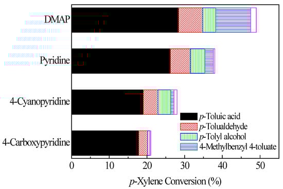 Encouraged by the results, we further tested several different pyridine analogues for catalytic oxidation of p-xylene (Figure 2). DMAP showed better catalytic activity than 4-carboxypyridine, 4-cyanopyridine and pyridine. The conversion of p-xylene increased in the order of 4-carboxy-pyridine < 4-cyanopyridine < pyridine < DMAP. Electron-donating group substituted pyridine exhibited higher activity than electron-withdrawing group substituted pyridine.