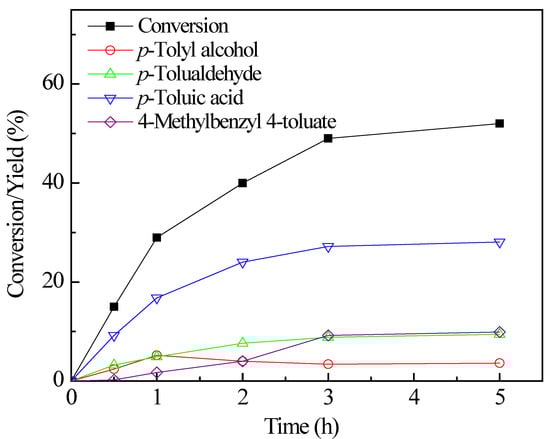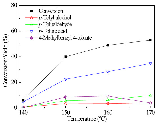 More detailed optimization of the reaction conditions including temperature and time was also carried out. The influence of temperature on the oxidation of p-xylene is shown in Figure 3. When the temperature was increased from 160 °C to 170 °C, the p-xylene conversion increased a little from 49% to 53%, accompanied by an increase in the by-products including 2-benzyl-p-xylene and 2,5,4'-trimethyldiphenylmethane. The formation of the by-products could be caused by alkylation of p-xylene [28,29]. The decreased reaction temperature led to much lower conversion. Therefore, the reaction temperature was optimized as 160 °C.