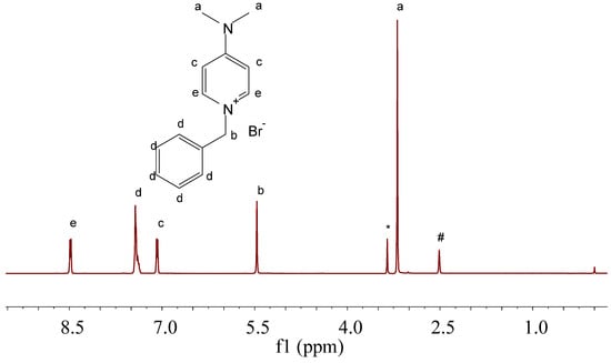 For oxidations of methyl aromatics involving bromo species, benzyl bromide (or its analogues) are easily formed, and are usually thought to be inert for catalytic oxidation [26,27]. When DMAP was introduced, benzyl bromide readily reacted with this nucleophlic base and formed the corresponding onium salt. Previous reports have noticed that the onium salts were effective in promoting hydrocarbon oxidations [31,32]. Therefore, the in situ formation of a pyridine onium salt may account for the enhanced activity of DMAP/benzyl bromide. Indeed, when DMAP and benzyl bromide were stirred under 160 °C in p-xylene, the pyridine onium salt can be separated as a pure product. The structure was confirmed by 1H-NMR as 1-benzyl-4-N,N-dimethylpyridinium bromide [δ = 8.48 (d, 2H), 7.55–7.29 (m, 5H), 7.12–7.04 (m, 2H), 5.51–5.42 (m, 2H), 3.24–3.14 (m, 6H); Figure 5]. Using this onium salt as catalyst, the p-xylene oxidation proceeded with a conversion of 51% (Table 3, entry 6), which is comparable to the result employing DMAP and benzyl bromide as shown in Table 1, indicating that the real catalyst could be the corresponding pyridine onium salt.