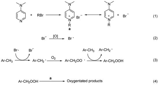 The liquid-phase oxidation of hydrocarbon generally follows the radical chain oxidation mechanism. The present reaction may be also based on the same mechanism, which is supported by the observed inhibition of oxidation in the presence of trace amount of p-cresol. In light of all information above, we propose the reaction mechanism to be as shown in Scheme 2. Alkyl bromide readily reacts with DMAP and forms the corresponding onium salt. The organic bromide is converted into ionic bromide, which is easily oxidized into a bromo radical under elevated temperature [8,33]. The bromo radical then abstracts hydrogen atom from the benzylic positions. Similar activation of hydrocarbons by a bromo source is observed in photooxidations [21,22]. This may explain why the bromo source is crucial for the catalysis. The benzyl radical traps molecular oxygen and forms a peroxy radical and hydroperoxide. According to previous reports, the decomposition of hydrperoxide can be promoted by onium salts, which is favorable for further propagation of the radical chain oxidation and affords oxygenated products [31,32].