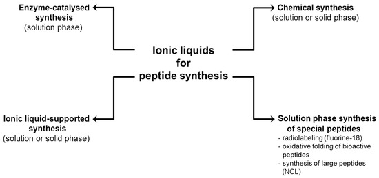 Nowadays, a large variety of methods is available to produce or obtain peptides, including isolation from natural sources (e.g., extraction from plants, animals and other organisms), recombinant synthesis, and production by chemical or enzymatic synthesis [19,20,21,22,23]. Only a few manuscripts have reported that ILs can be applied in this field of peptide assembly as pure solvents, as co-solvents in aqueous systems or as biphasic systems [8,24], in both, solid and solution phase synthesis as well as in enzyme-catalyzed peptide synthesis (Figure 1).
