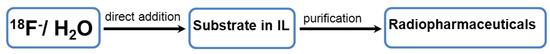 A new approach in this respect has been proposed by Kim et al. in 2003 (Figure 4) [37]. Herein, fluorine-18 labeling of alkyl mesylate or alkyl halides, e.g., 2-(3-methanesulfonyloxypropoxy)-naphthalene, in ILs containing a hydrophobic cation ([C4mim][X], where X = [BF4]−, [PF6]−, [SbF6]−, [OTf]−, [NTf2]−) was described for the first time. This method was successful despite the addition of a small amount of water, which is in contrast to the conventional method used. The ILs enhanced the reactivity of fluorides and also, a reduction of by-product formation (alkenes, alcohols) was observed. This approach led to further developments in this field as reported by Schirrmacher et al. [38]. The IL [C4mim][OTf] was useful for the labeling of short model peptides, e.g., GSH [38]. Thus, radiolabeling performed in IL (1,3-dialkylimidazolium salts) obviously occurs without the need for complicated procedures and strictly anhydrous conditions, but by direct addition of the IL to the reaction mixture and further simple purification steps.