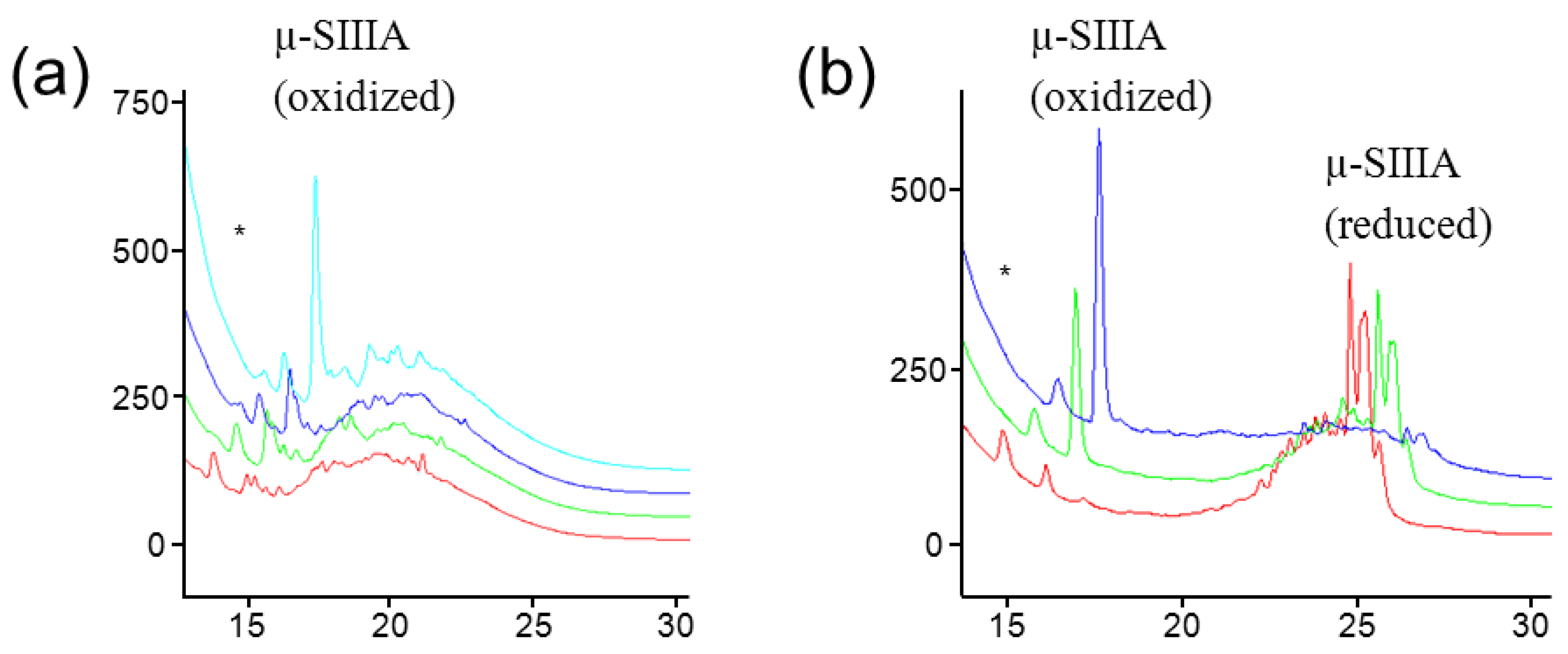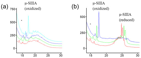 RP-HPLC elution profiles of µ-SIIIA (crude mixtures) after oxidative folding in [C2mim][OAc] depending on (a) water content (cyan with 3% water, blue—5%, green—7.5%, red—10%) and (b) temperature (blue curve—80 °C, green—60 °C, red—40 °C). * Peak from ionic liquid.