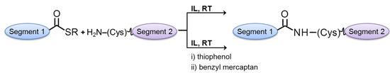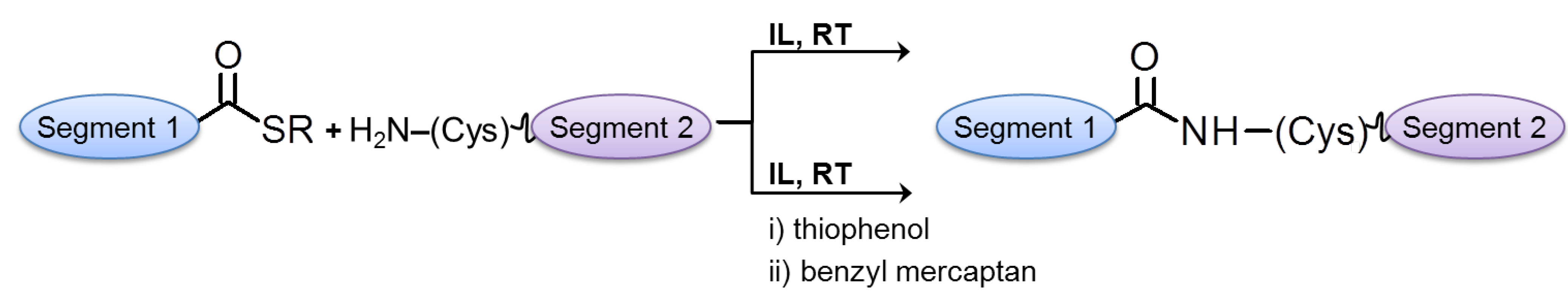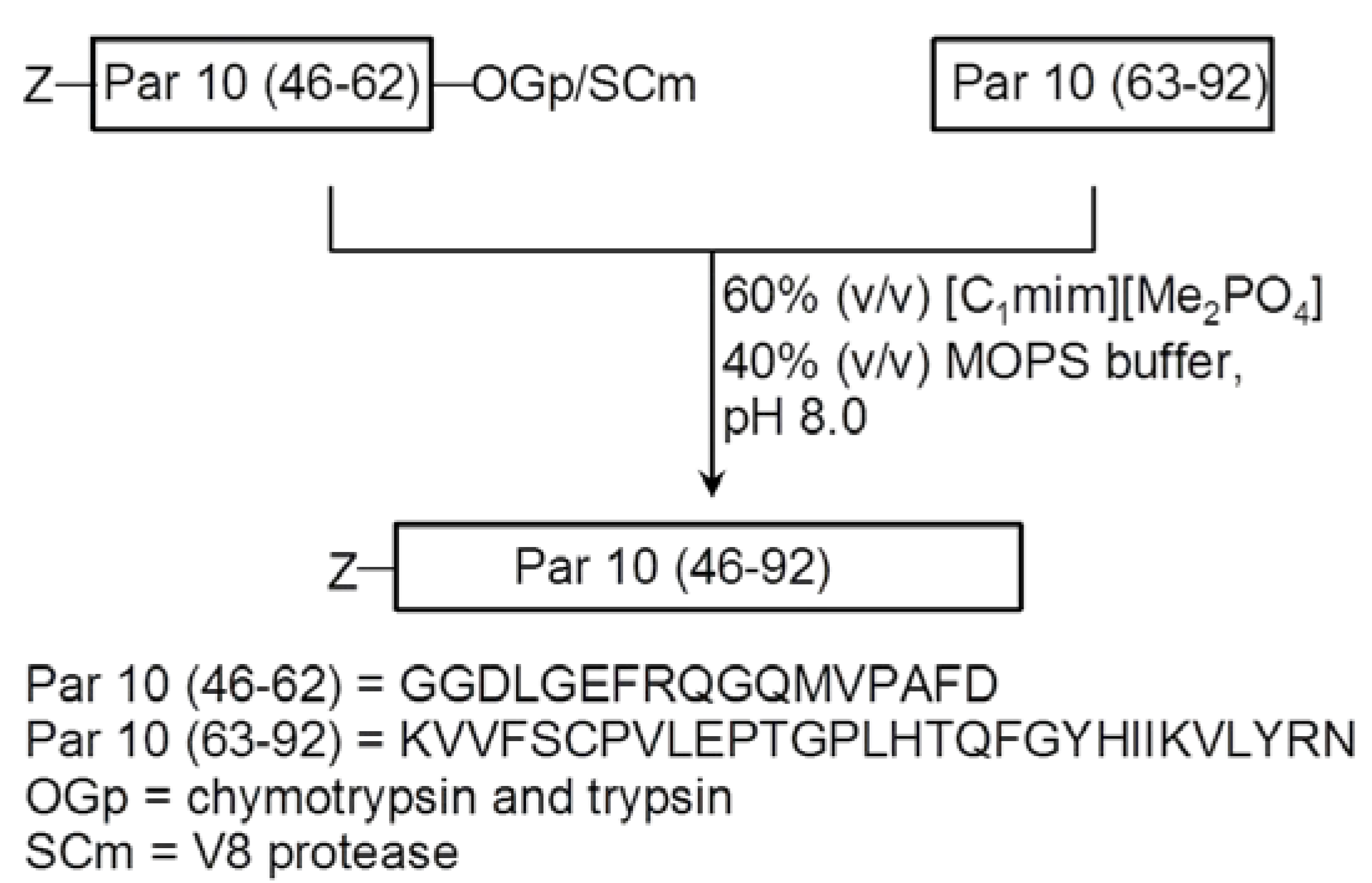 | 1-ethyl-3-methylimidazolium X 1-butyl-3-methylimidazolium acetate | [C2mim][X], (X = OAc, DEP, OTs, N(CN2)2) [C4mim][OAc] | Oxidative folding and native chemical ligation of cysteine-containing peptides | [14,39] |