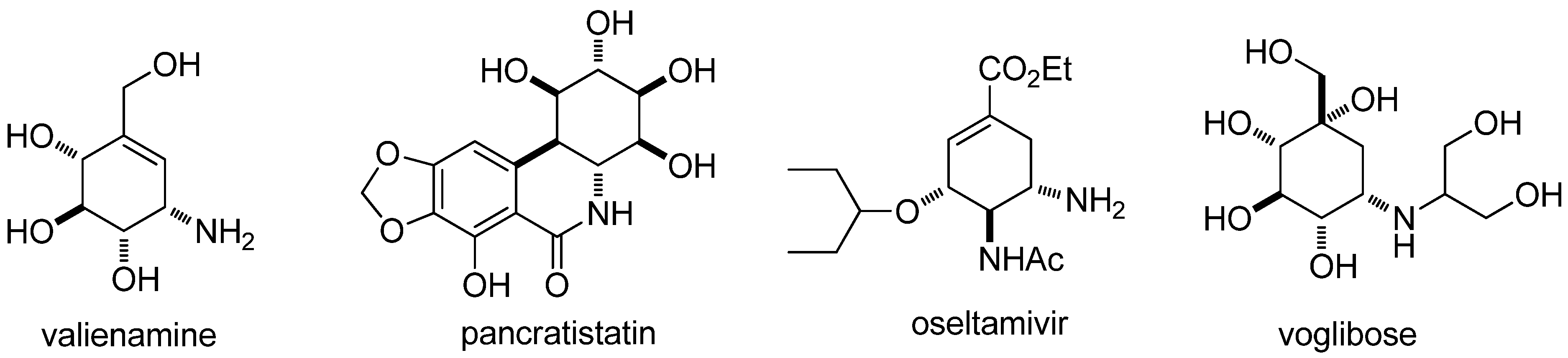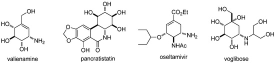 Aminocyclitols, also known as aminocarbasugars [1], contain at least one amino or substituted amino moiety in the cyclitols (polyhydroxylated cycloalkanes) [2]. Many natural and synthetic products containing aminocyclitol scaffolds have shown a variety of biological activities [3,4], such as, valienamine [5], pancratistatin [6], oseltamivir [7], and voglibose [4] (Figure 1). The synthesis of biological active aminocyclitols and assessment of their structure and activity relationship have generated considerable interest in recent years [4,8,9,10,11,12,13,14,15,16,17].