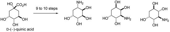 - Shih, T.-L.; Li, H.-Y.; Ke, M.-S.; Kuo, W.-S. Synthesis of a new family of aminocyclitols from D-(−)-quinic acid. Synth.Commun. 2008, 38, 4139–4149. [Google Scholar]