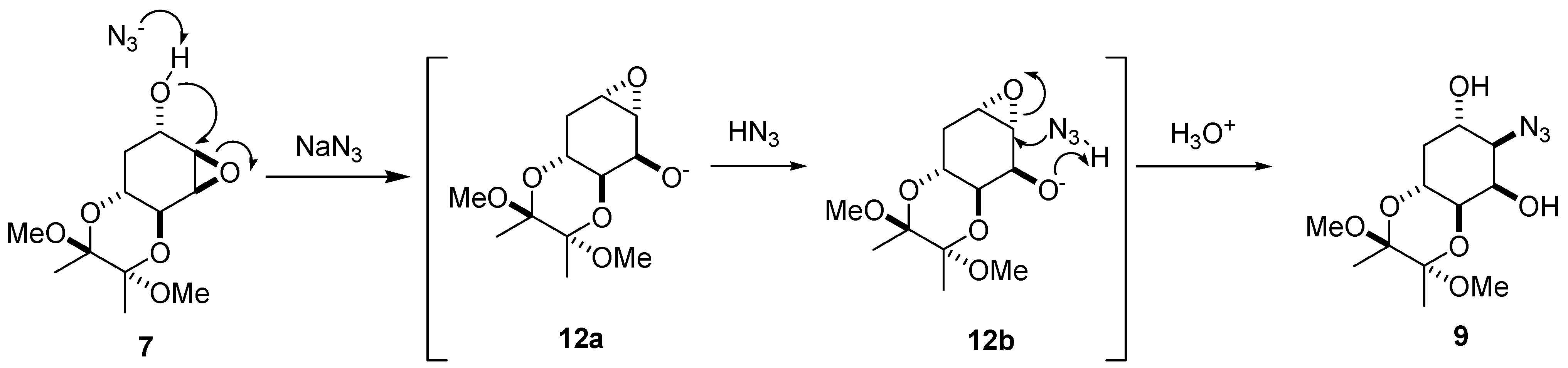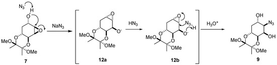The yields were mediocre but no other regioisomers were detected by TLC or isolated from column purification [20]. Interestingly, the TMB-protected compound 7 was treated with NaN3 to afford 8 in 71% yield and its epimer 9 in 14% yield. The azide directly attacked the least hindered side of 7 at the C4 position to give 8. However, a plausible mechanism for the formation of the minor component 9 results from the C5 hydroxide group of 7 being attacked at the C4 position to give intermediate 12a (Figure 3).