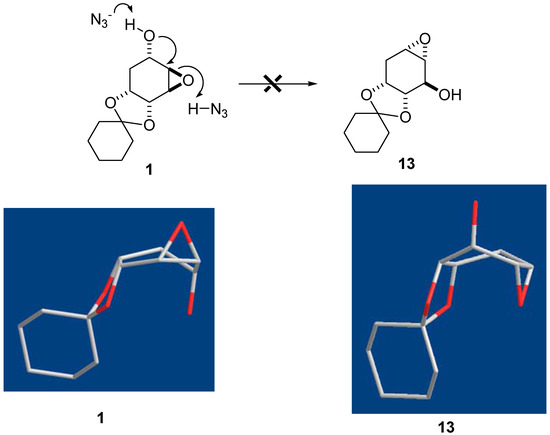 The Payne rearrangement of epoxide 7 intrigued us as an interesting issue when no rearrangement product 13 was found when compound 1 was treated with NaN3 (Figure 5). According to the Chem3D simulation, the conformation of cyclohexane core of 1 is a slightly twisted boat form. However, compound 13 was in a boat conformation if the Payne rearrangement occurred. The reason was probably due to the steric congestion in the formation of 13 because the distance between epoxide and the C2 acetal oxygen atom of 13 is around 3.054 Å. On the contrary, the distance between the C5-OH and C2 oxygen atom of 1 is about 3.328 Å. Therefore, the trans-diaxial attack at C4 of 1 by azide might be kinetically or sterically controlled to lead to the major component 3.