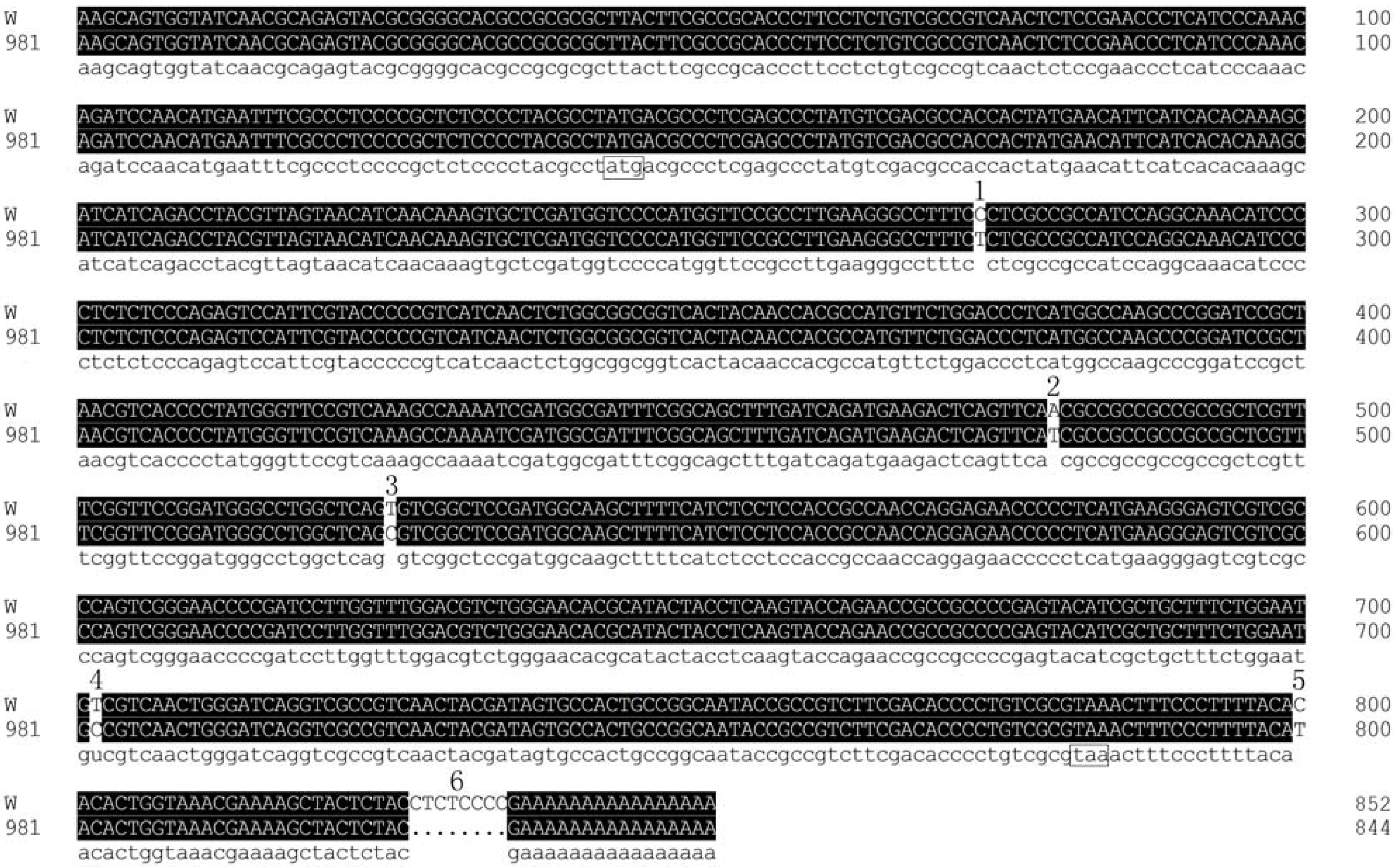 The full-length cDNA of Mn-SOD obtained from the wild strain was 852 bp, with a GC content of 56.4%. The full-length cDNA from cultivar 981 was 844 bp, with a GC content of 56.2%. Alignment of the sequences of the two strains is shown in Figure 1. There were six differences between the two sequences.