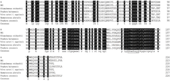 Alignment of Mn-SOD amino acid sequences of G. lemaneiformis and other algae. DVWEHAYY is the conserved metal-binding domain. The corresponding proteins are listed as follows: Porphyra haitanensis (ACD75820.1), Porphyra yezoensis (AAZ75664.1), Chlamydomonas reinhardtii (XP_001700058.1), Haematococcus pluvialis (AAW69292.1), Volvox carteri f. nagariensis (XP_002958467.1).