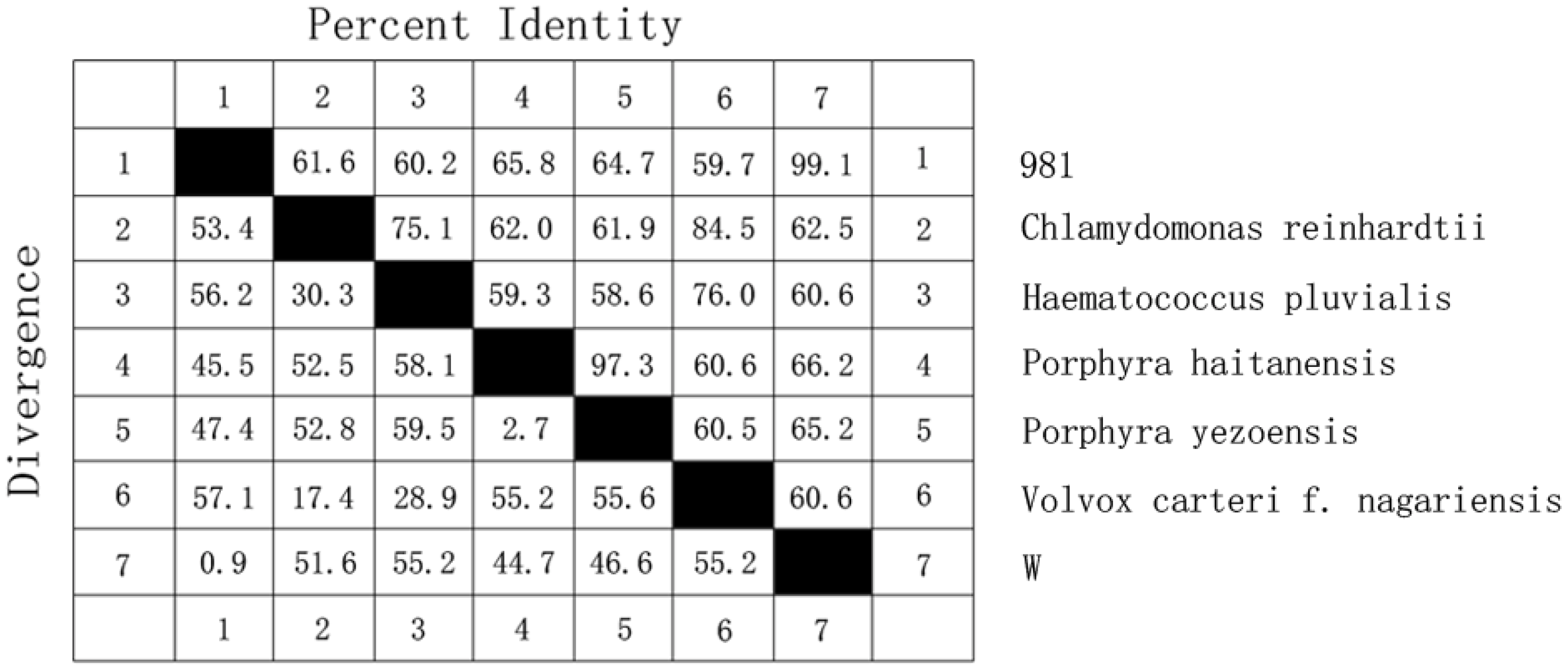 Percent identity and divergence between G. lemaneiformis and other algae.