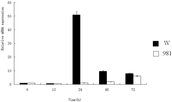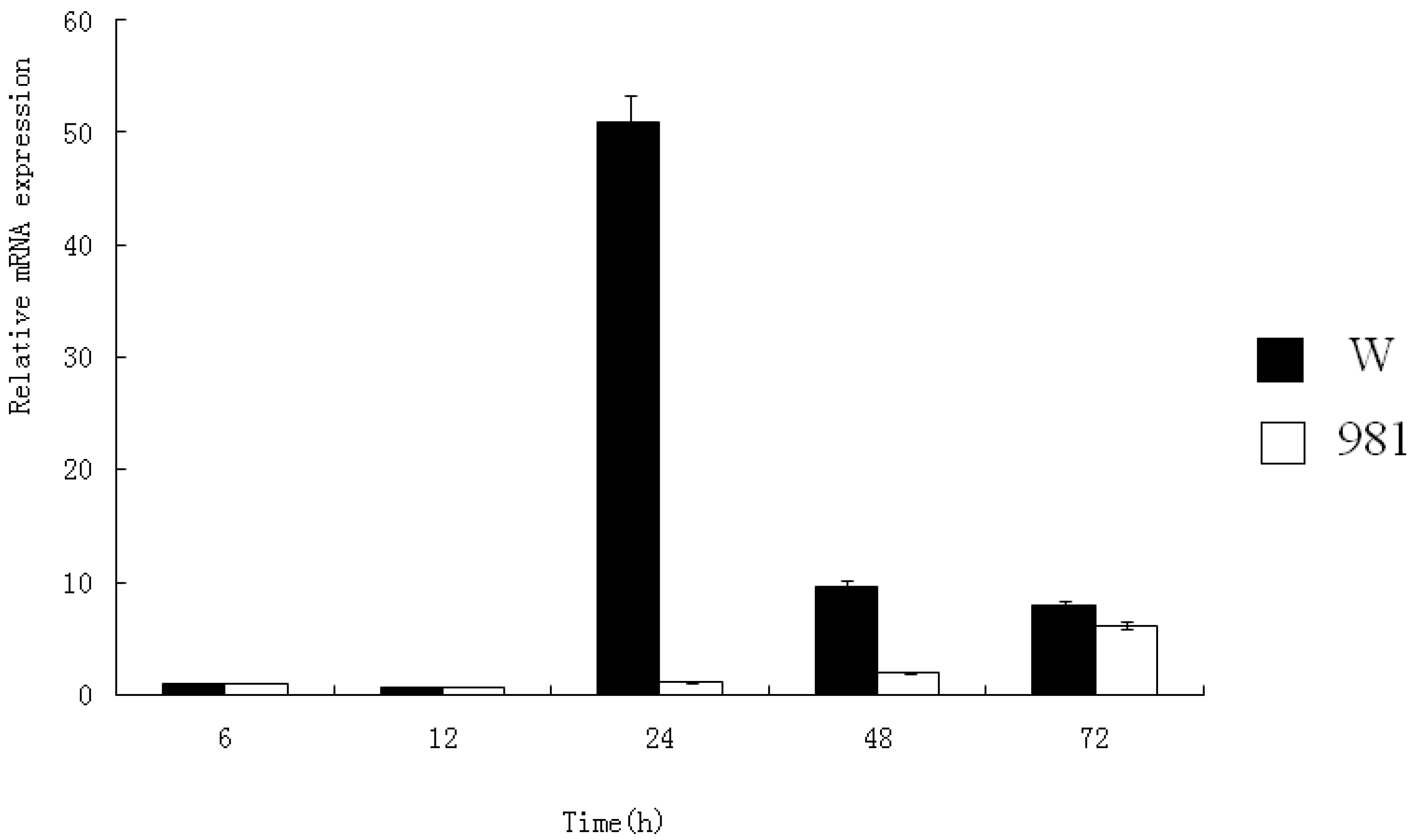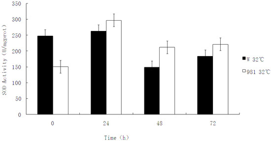 SOD activity under high temperature stress was assayed. Figure 6 shows that without high temperature stress (0 h), the SOD activity of the wild strain was higher than that of cultivar 981. However, under temperature stress, the SOD activity of 981 increased over that of the wild strain at all time points. This result shows that cultivar 981 can actively respond to heat stress and suggests that it removes ROS effectively to help overcome the detrimental effects of high temperature.