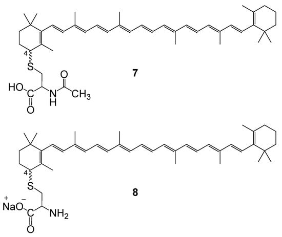 In a similar way sulphur-containing amino acids can be coupled to carotenoids in good yields. With N-acetylcysteine as a nucleophile the products obtained are carotenoid-cysteine conjugates in which the amino acid moiety binds the carotenoid via sulphur (compound 7, Figure 2). The water-dispersibility of the products can be increased by deprotection of the amino group to obtain compounds like 8 [].