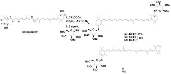 Only a few methods have been published for the chemical synthesis of carotenoid glycosides: direct glycosylation of carotenoid alcohols using the classical Königs-Knorr procedure [,] and total synthesis starting from 3-hydroxy-β-ionone [,]. Glycosides of astaxanthin were also prepared by a biosynthetic process [].