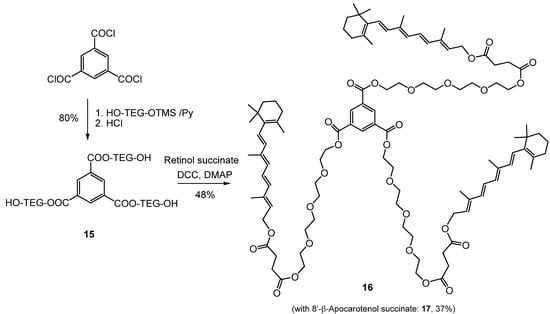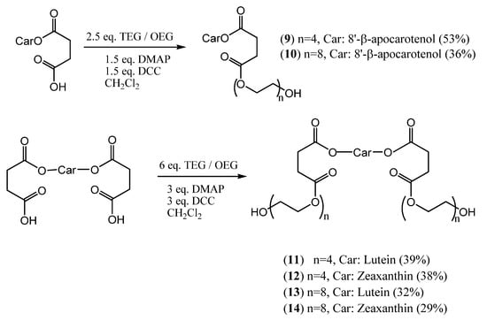 Carotenoid-PEG esters and diesters were synthesized from several carotenoid succinates [] with polyethyleneglycols of different chain length [tetraethyleneglycol (TEG), octaethyleneglycol (OEG), PEG-550 monomethyl ether (mPEG-550), Scheme 2] []. The same way carotenoid dimers and trimers that have a PEG spacer between the carotenoids were synthetized in good yields (Scheme 3) [].