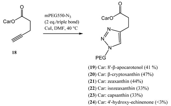 Recently, we introduced azide-alkyne click chemistry to the field of carotenoid synthesis. After optimization of the reaction conditions, PEG azides could be coupled to carotenoid derivatives bearing an alkyne moiety []. This method seems to work well with carotenoids (Scheme 4), so it could be used in the future to synthesize not only carotenoid-PEG conjugates but conjugates with other, bioactive molecules.