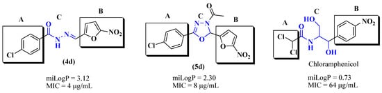 Coincidentally, the drug chloramphenicol chosen as standard in the studies of anti-staphylococcal activity has some structural similarity to the compounds 4a–e and 5a–e. In fact, this similarity is clearer considering the structures of the compounds 4d, 5d and chloramphenicol and taking into account three distinct regions in their structures: the region (A) containing the groups 4-chlorophenyl in the compounds 4d and 5d and dichloromethylene in the structure of the chloramphenicol, the region (B) containing the groups 4-nitrofuranyl in the compounds 4d and 5d and the 4-nitrophenyl in the structure in the chloramphenicol and the region (C) represented in blue, containing both amide functions (Figure 2).