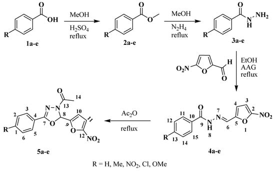 In step 1, the aromatic esters 2a–e were obtained in quantitative yields by Fischer esterification of the respective aromatic carboxylic acids 1a–e. In step 2, hydrazinolysis of the esters 2a–e with hydrazine hydrate (80%) provided aroylhydrazides 3a–e in excellent yields. Step 3 gave N-acylhydrazones 4a–e in high yields and purity by condensation reaction between the respective aroylhydrazides 3a–e and 5-nitro-2-furaldehyde in ethanol (95%) with glacial acetic acid as the catalyst [33].