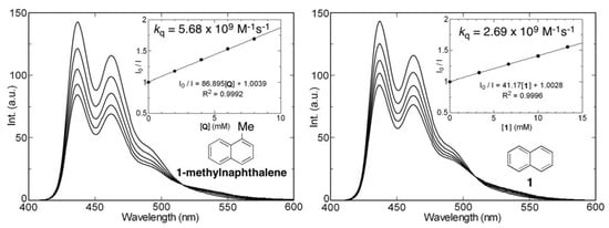 Experiments were carried out to evaluate how the electronic and steric effects of silyl groups govern the ability of naphthalene derivatives to serve as quenchers of the singlet excited state of 9,10-dicyanoanthracene. For this purpose, fluorescence emission intensities of benzene solutions of 9,10-dicyanoanthracene in the presence of various concentrations of 1-methylnaphthalene and the naphthalene derivatives 1–3, 6 and 8 were determined (Figure 10). The rate constants of 9,10-dicyanoanthracene fluorescence quenching, calculated by using Stern-Volmer analysis and falling in range of 5.68 × 109 to 1.06 × 109 M−1s−1, were observed to decrease in the following order: 1-methylnaphthalene > 1 > 3 > 2 > 6 > 8.