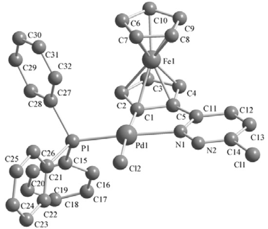 A solution of chloride-bridged palladacyclic dimer 1a (0.1 mmol) and triphenylphosphine (0.22 mmol) in CH2Cl2 (10 mL) was stirred at room temperature for 30 min. The product was separated by passing through a silica gel column with dichloromethane as eluent. The first band was collected to afford complex 2a after the evaporation of the solvent. [PdCl{[(η5-C5H5)]Fe[(η5-C5H3)-N2C4H2-Cl]}PPh3] (2a): Yield 90%. Found (%): C, 55.1; H, 3.4; N, 4.2. Calc. (%) for C32H25Cl2FeN2PPd: C, 54.8; H, 3.6; N, 4.0. IR (KBr, cm-1): 3045, 1584, 1533, 1472, 1435, 1392, 1376, 1273, 1161, 1097, 999, 855, 815, 743, 689. 1H-NMR (CDCl3): δ 7.84–7.80 (m, 6H, ArH), 7.40–7.33 (m, 11H, ArH), 4.65 (s, 1H, C5H3), 4.22 (s, 1H, C5H3), 3.75 (s, 5H, C5H5), 3.43 (s, 1H, C5H3).