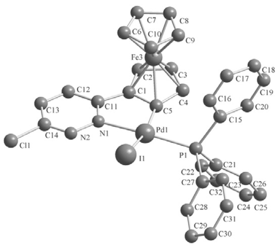 Single crystals of these complexes were obtained by crystallization from CH2Cl2-petroleum ether at room temperature. The molecular structures are shown in Figure 1, Figure 2, Figure 3. The crystal structure of 3b reveals two molecules in the asymmetric unit with different geometry (corresponding values for the second structure are given in brackets). Selected bond lengths and angles are listed in Table 1. The single-crystal X-ray analysis reveal that all complexes display trans configurations in the solid state. The Pd atom in each cyclopalladated unit is in a slightly distorted square-planar environment, being coordinated to phosphorus, chlorine (iodine), nitrogen and the carbon atom of the ferrocenyl moiety. The Pd–N [2.144(7)–2.160(6) Å] and Pd–P [2.236(2)–2.246(2) Å] bond lengths of 3a,b are similar to those of the corresponding 2a,b [2.140(3)–2.1418(19) and 2.2322(11)–2.2369(7) Å], while Pd–I [2.6491(10)–2.6752(12) Å] bond lengths of 3a,b are obviously longer than the Pd–Cl [2.3393(8)–2.3642(2) Å] bond lengths in the corresponding adducts 2a,b [11].