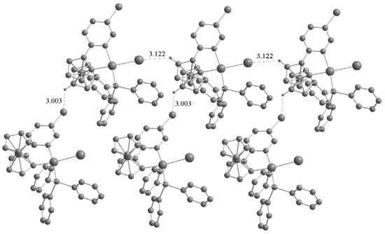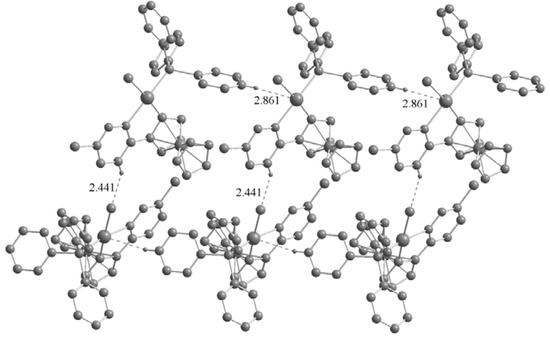 The most striking common feature of the structures of the three palladacycles is the intermolecular C–H···X (Cl, Br, I) hydrogen bonds (Figure 4 and Figure 5). The C–H···X–M hydrogen bonding can be used to assemble transition metal based building blocks into supramolecular structures since the H-bonding acceptor capability of terminal metal-bound chlorine (M–X) is stronger than their C–X analogues in organometallic compounds [12,13]. Basically, the crystal structures of the two complexes 2a and 3a are quite similar, with chlorine (iodine) anion forming C–H···X(Cl, I) hydrogen bonds (Cl···H = 2.441 and I···H = 3.061 Å), however, the chlorine atom in the pyridazine ring does not participate in hydrogen bonding. It is noteworthy that intermolecular C–H···Pd hydrogen bonds are present in the crystals of 2a (Pd···H = 2.861 Å) and 3a (Pd···H = 2.736 Å). Although these interactions have been extensively studied [14], there are a few reports concerning palladacycles [15,16,17]. Owing to the C–H···X(Cl, I) and C–H···Pd hydrogen bonds, the crystal structures of the 2a and 3a are extended to a 2D network architecture (Figure 4). Unlike 2a and 3a, the complex 3b has a one-dimensional chain structure formed by C–H···I hydrogen bonds between an iodine atom and the adjacent C–H group of the Cp ring. This is different from that of 2b which presents C–H···Cl hydrogen bonds between a chlorine atom and the adjacent C–H group of the pyridine ring [11]. In addition, C–H···Br hydrogen bonds between bromine atom and the adjacent C–H group of Cp ring are also present in the crystal of 3b (Figure 5).