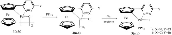 A new triphenylphosphine adduct of cyclopalladated ferrocenylpyridazine containing a chloride anion, 2a, has been synthesized from the reaction of the chloride-bridged palladacyclic dimer 1a with triphenylphosphine. The corresponding adducts 3a,b containing iodide anion have been readily prepared through anion exchange reactions of 2a,b with NaI in acetone. These complexes were characterized by elemental analysis, IR and 1H-NMR. Additionally, their crystal structures have been determined by X-ray diffraction and intermolecular C–H···X (Cl, Br, I) bonds were found in the crystals. The use of these palladacycles as catalysts for the Suzuki and Sonogashira reactions was examined. The complexes 2a,b exhibited higher catalytic activity than the corresponding 3a,b in the Suzuki reaction. However, the order of activity of adducts with varying halogen anions is 3a~3b > 2a~2b in the Sonogashira reaction.