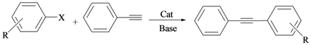 A prescribed amount of catalyst, aryl halide (0.5 mmol), phenyl boronic acid (0.75 mmol) or alkyne (0.6 mmol) and the selected base (1.5 mmol) in solvent (3 mL) were placed in a Schlenk tube under nitrogen. The reaction mixture was heated at 100 °C–120 °C for 12–24 h, then cooled and quenched with water. The reaction mixture was extracted three times with CH2Cl2, then the combined organic layers were washed with water, dried (MgSO4), and evaporated to dryness. The products were isolated by flash chromatography on silica gel using petroleum ether as eluent and analyzed by 1 H-NMR.