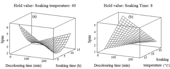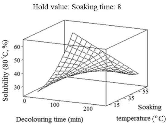 | Runs | Blocks | Decolouring time (x1, min) | Soaking time (x2, h) | Soaking temperature (x3, °C) |