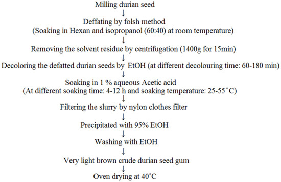 - Amin, A.M.; Ahmad, A.S.; Yin, Y.Y.; Yahya, N.; Ibrahim, N. Extraction, purification and characterization of durian (Durio zibethinus) seed gum. Food Hydrocol. 2007, 21, 273–279. [Google Scholar] [CrossRef]